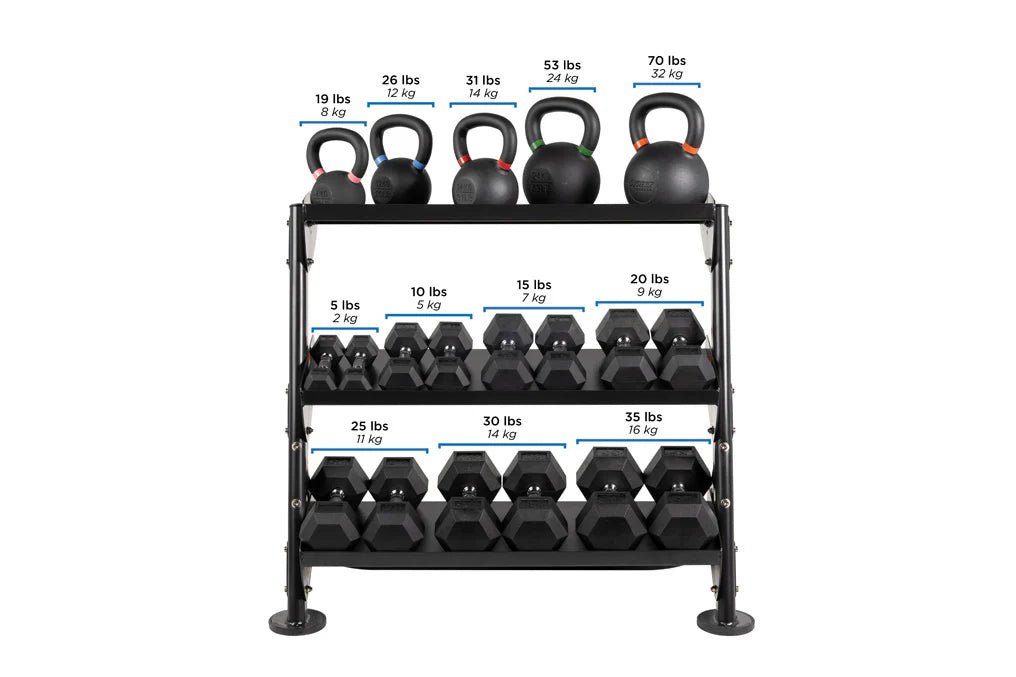 Tray design: Wide channels accommodate most hex dumbbells and small accessories.
