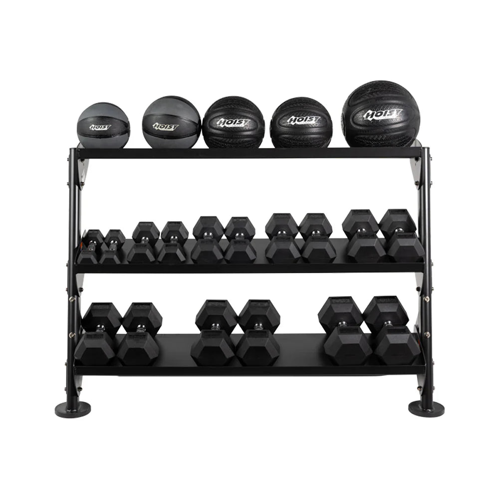 Fits: With optional 3rd tier, accommodates hex dumbbells up to ~5–55 lb pairs (capacity varies by head width)